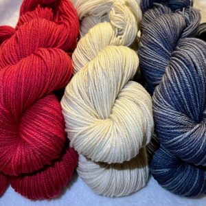 Yarn: Imperial Yarn McKenzie – 3 Hanks, 1 each Natural, Firecracker and Royal Blue