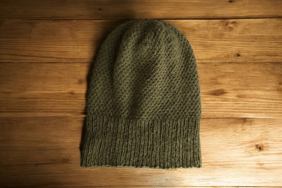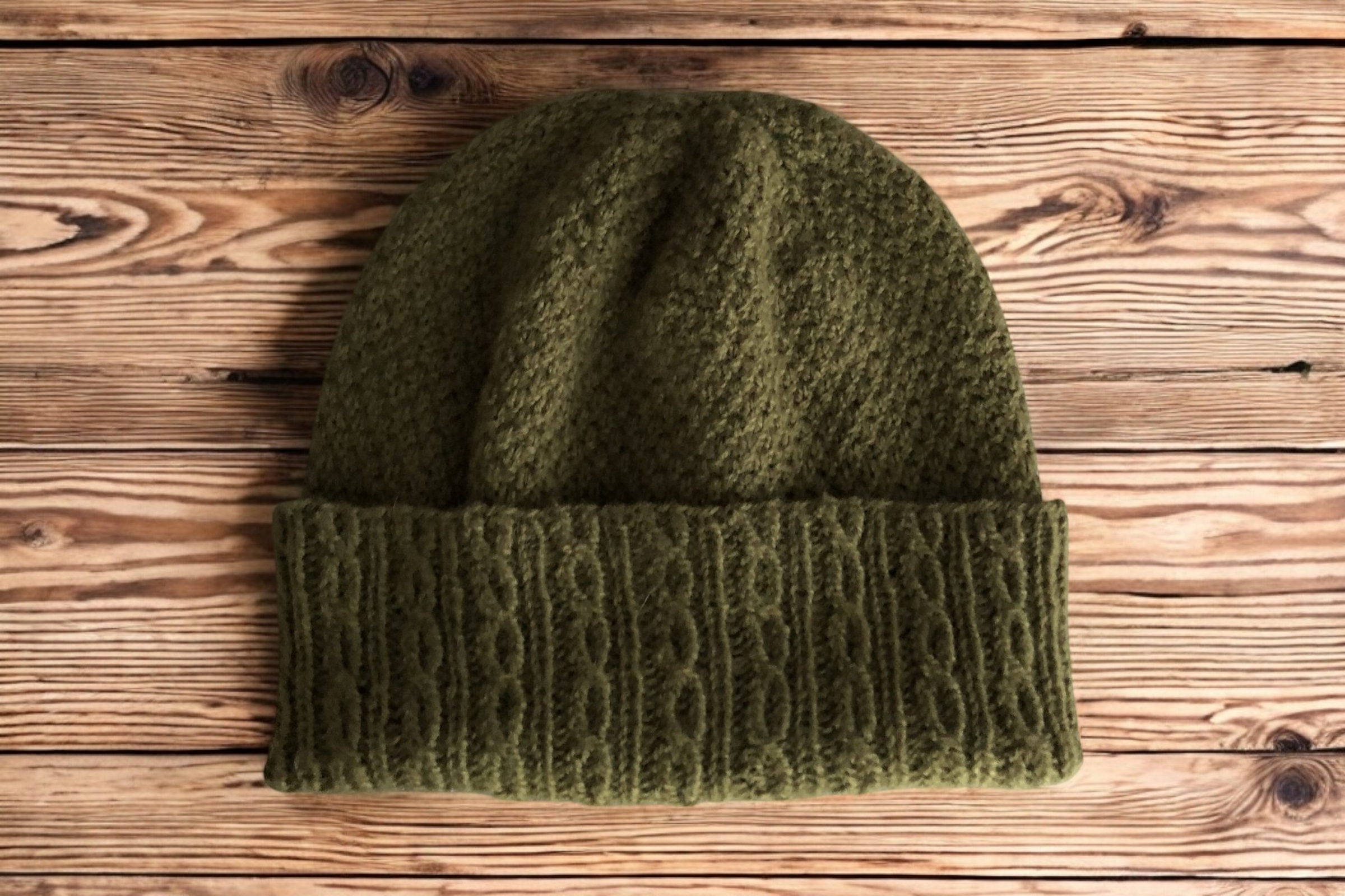 - Size: 10-3/4” tall, uncuffed, 16” circumference cabled cuff, unstretched, 19” circumference moss stitch top, unstretched