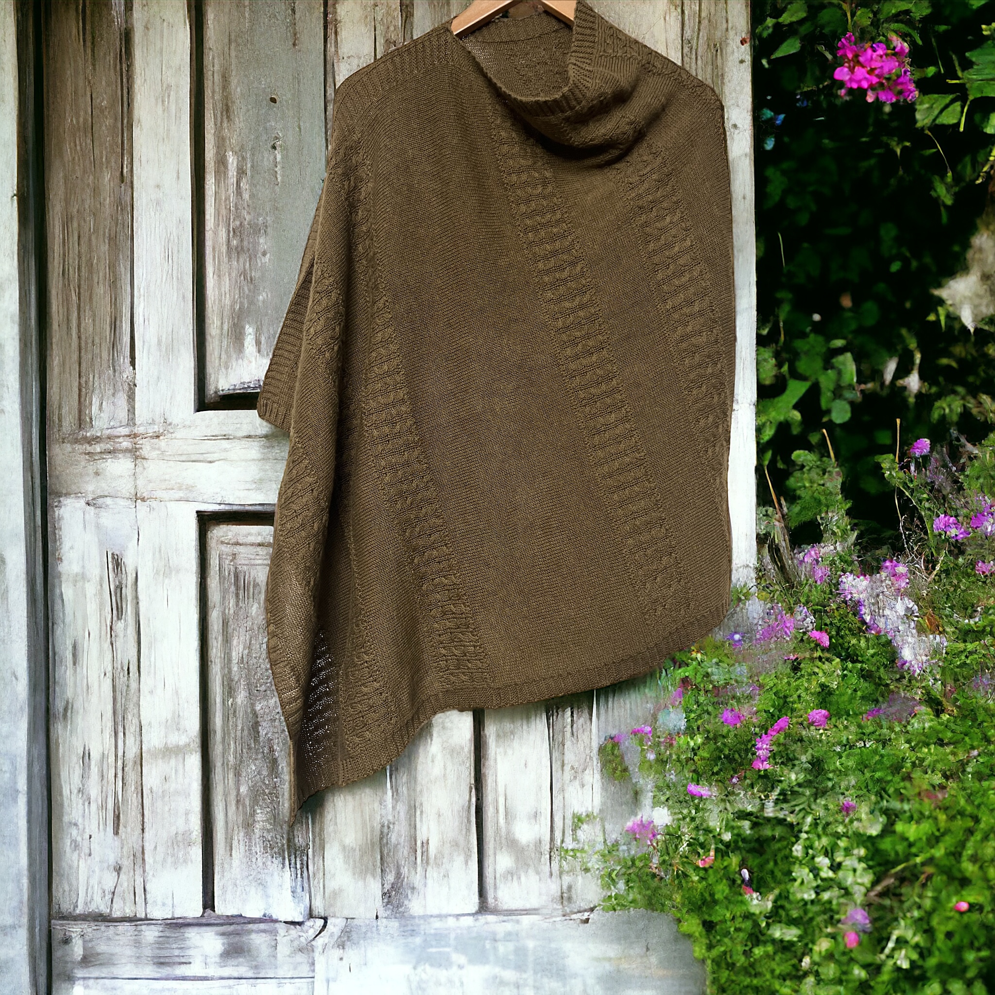 The asymmetrical hem of the poncho adds to the style and grace. The Spheres collection design and is flattering to all body shapes and sizes! The blend of cotton, alpaca and merino wool blend gives the cotton a nice hand feel.