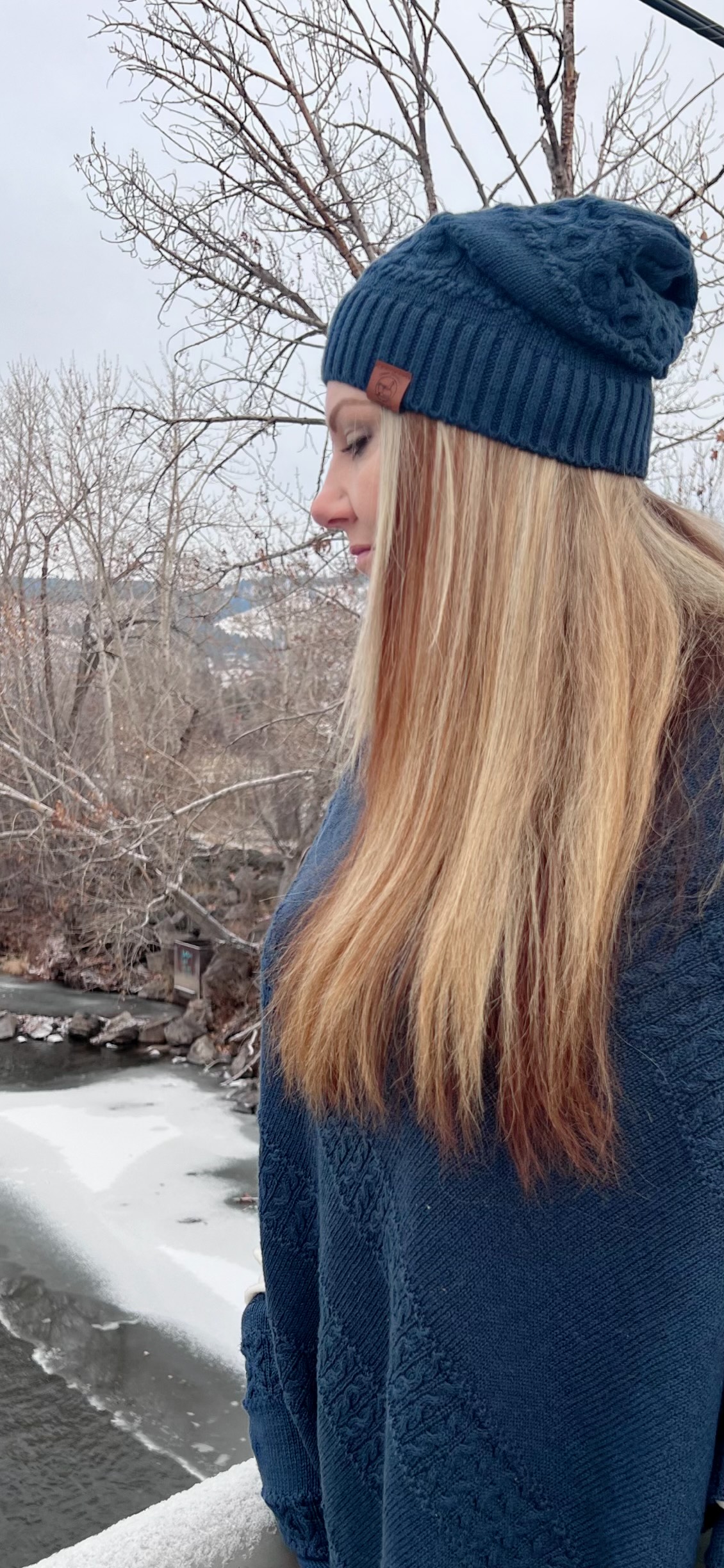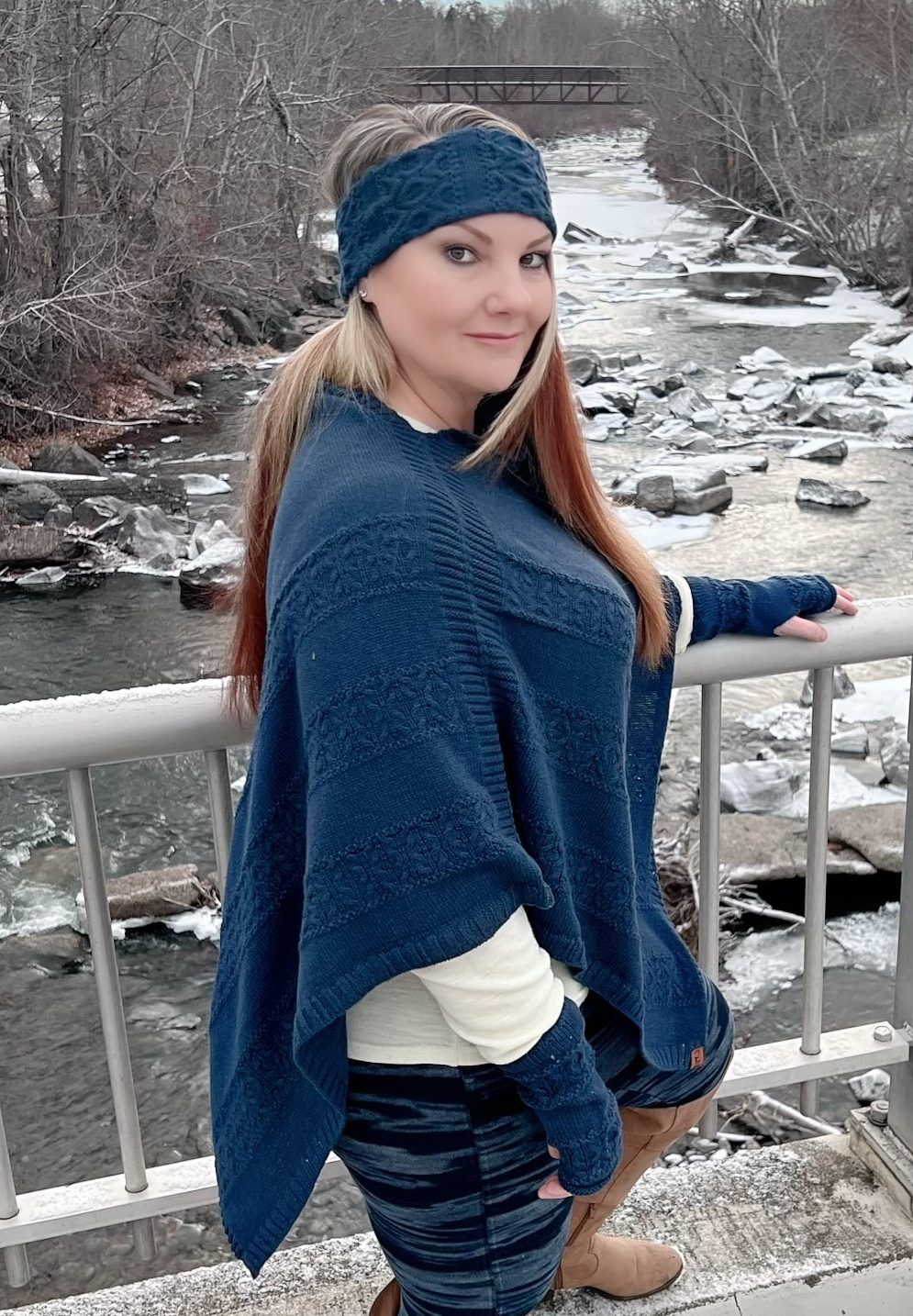 CoPacaWoo Spheres Collection; Coordinating hats, headbands, finger-less mitts, scarfs and ponchos. The poncho is available in four stunning colorways from our CoPacaWoo = cotton, alpaca and merino wool.