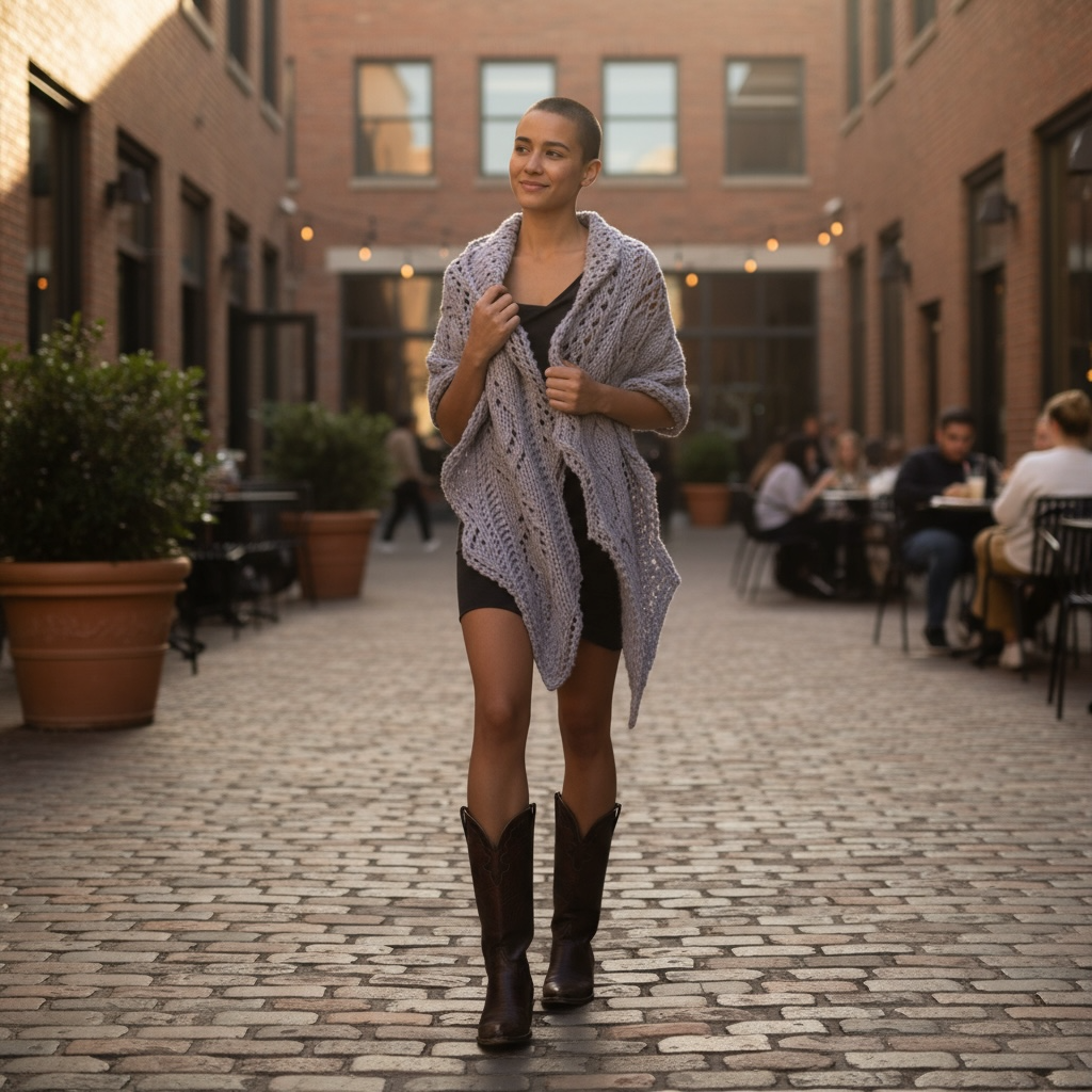 The Glamour Shawl Kit is fun to knit and easy to wear! The loft of this bulky alpaca/wool yarn allows for almost instant gratification, as your shawl takes shape, knitting the large lace pattern. This super soft, versatile piece can be worn straight or as a wrapped shawl. It can also be worn with a turned “collar”, and it is absolutely adorable when worn with a belt!
