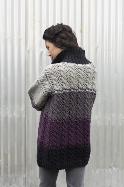 Notions: Cable needle; stitch holders or waste yarn; tapestry needle; eight 1¼” (32 mm) buttons (La Mode #20505).