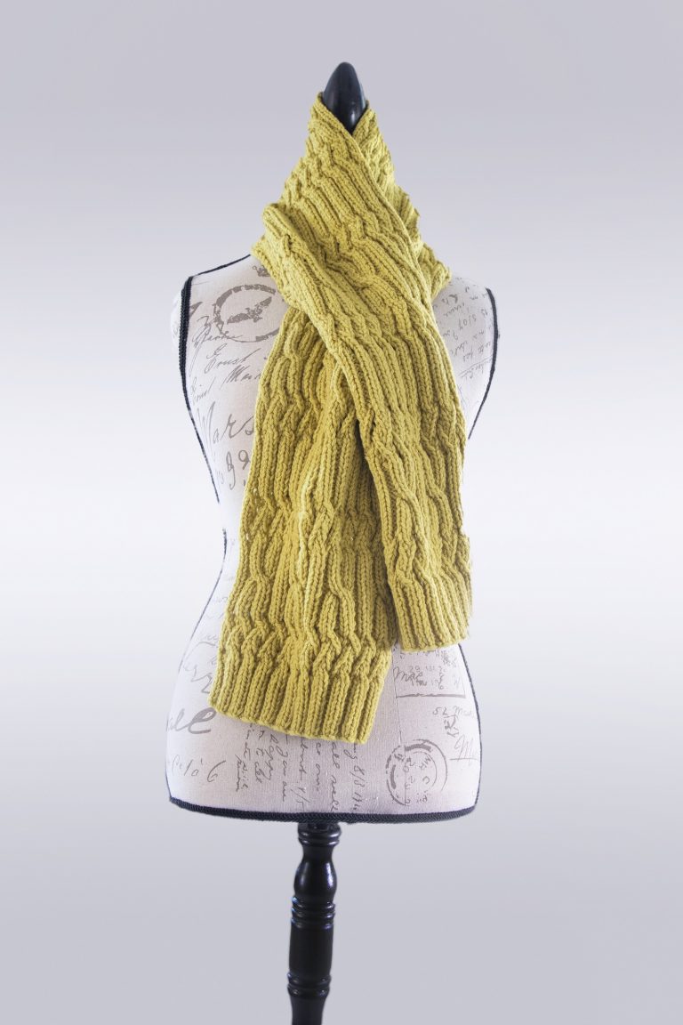 This one is patterned to knit your choice of either a scarf or a cowl. Both styles are adorned with gracious cabling, and both are equally elegant.