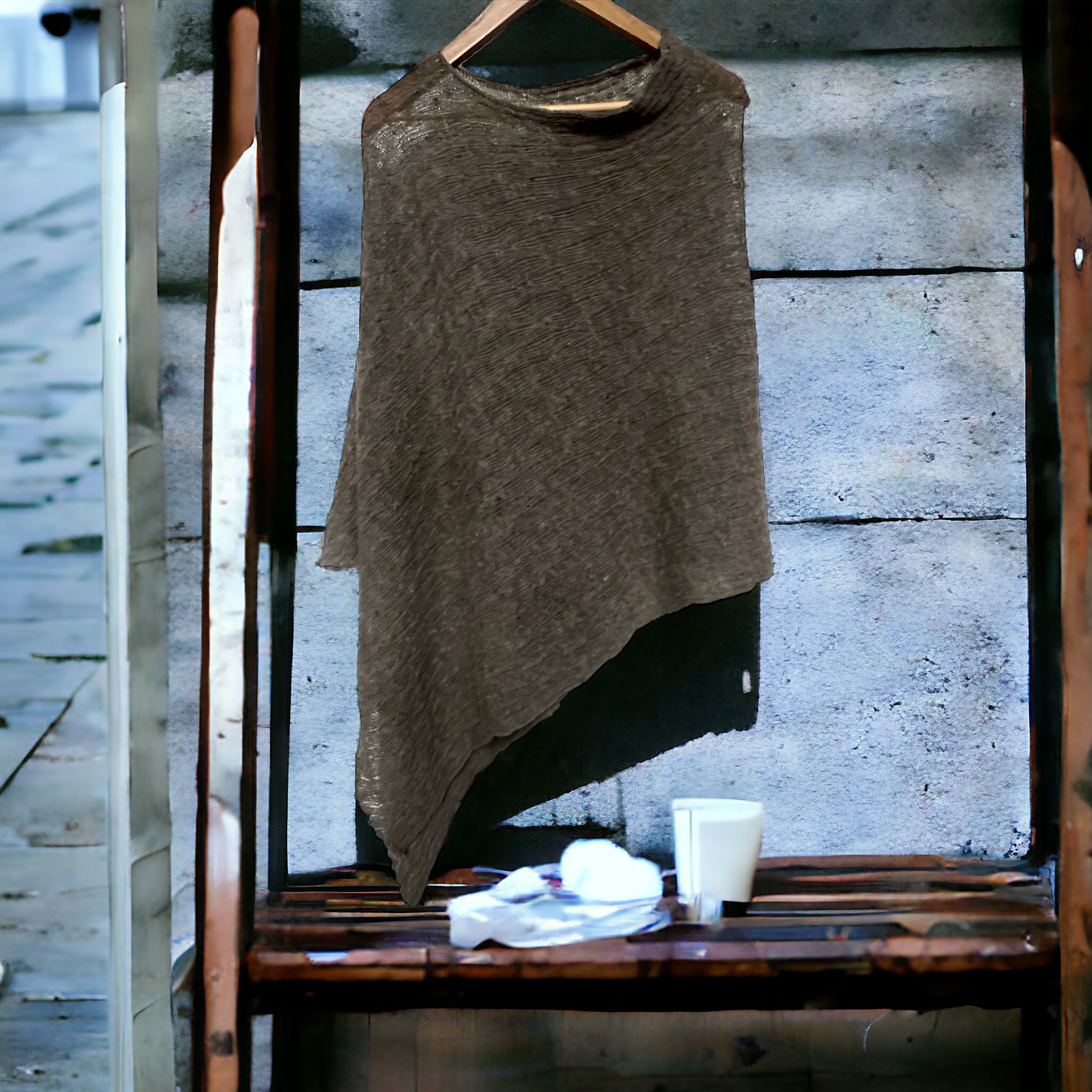 This poncho displays the drapey qualities alpaca is known for. The asymmetrical point is very flattering to everyone. Something that alpaca is known for is the warmth in a lightweight.