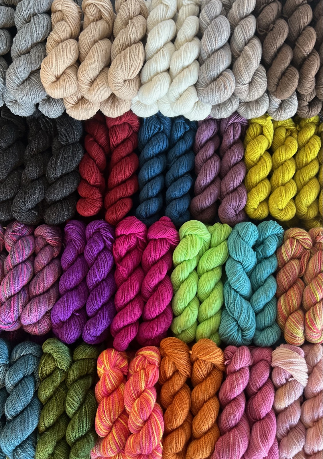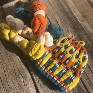 Each kit comes with the pattern, a project bag and 4 skeins of our worsted weight wool yarn Willamette, with 3 bright and bold options.