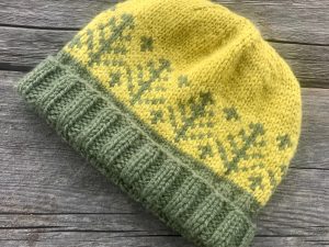 The charming color-work design on the Whimsey Hat makes it a treasured favorite among all ages! Made From 2 Skeins of our Willamette, worsted yarn. This 100% wool produces a soft fabric with beautiful stitch definition and generous stretch. Experienced knitters will love the unique vertically striped brim and folk-inspired evergreen motifs. The optional pompom and 16 color options make it easy to customize this hat to your style. Designed by Tanis Gray.